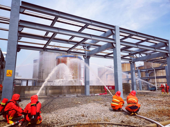 本次演練堅持從實戰(zhàn)出發(fā),模擬中間罐區(qū)重芳烴泄漏發(fā)生火災,造成人員受傷。演練過程中,巡檢工在庫區(qū)周邊巡查,發(fā)現(xiàn)重芳烴儲罐出口管道泄漏,引起著火,立即打開重芳烴儲罐噴淋水,同時撥打119報警電話,公司迅速啟動公司級應急救援預案。指揮人員沉著冷靜,由該公司100余名員工組成的各個應急救援小組快速反應,到集合點集合,開展滅火、搜救行動??傊笓]許總向園區(qū)綜合執(zhí)法局報告現(xiàn)已啟動公司級應急救援預案進行搶險,請求園區(qū)消防隊支援。6分鐘后,消防車抵達,與消防站長迅速對接,介紹火情,布置任務后。該公司搶險救援隊與園區(qū)消防大隊消防員密切配合,開展人員疏散、傷員搜救、大氣檢測、多角度水帶噴射泡沫滅火等操作。迅速控制了險情,圓滿完成了預定科目的演練。