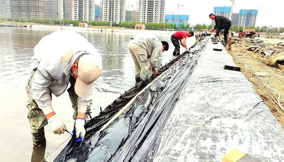 本次技能比武共有24名一線職工報名參加,分為4組,每組6人,以小組為單位,同規(guī)模、同長度、同條件格堰,在規(guī)定時間內(nèi)完成塑布安裝。