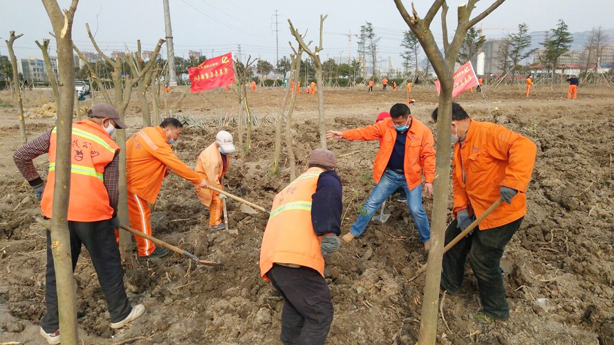 為保證植樹質(zhì)量,該公司配備多名專業(yè)技術(shù)人員進行全程技術(shù)指導。上午8時許,在移苗現(xiàn)場,一臺挖掘機轟隆隆地作業(yè)著,小心翼翼的將一棵棵大樹苗連根拔起,在保證不擠壓的情況下,輕抬輕放,裝苗運輸。在栽苗活動現(xiàn)場,全體工作人員戴好頭罩、手套等防護用具,在統(tǒng)一指揮下,彼此間隔1米左右,擼起袖子、揮著鐵鍬、扛著鋤頭飛快地投入到栽苗植樹作業(yè)中。大家分工協(xié)作,有的開槽挖坑;有的栽植樹苗;有的抬木扶苗;有的回填新土;有的纏繩護樹;有的澆水保濕……到處都是忙碌的身影,整個植樹活動現(xiàn)場一片熱火朝天的繁忙景象。放眼望去,在明媚的春光中,一排排新栽下的樹苗迎風挺立,生機勃勃,組成了一道道靚麗的風景線。