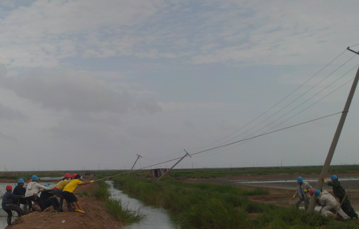 8月3日天剛亮,大家都顧不上休息,立即分片趕到受災現(xiàn)場巡視情況。東港工區(qū)洋井口8根高壓桿被刮倒,大瑞頭圩、二圩、新灘口和方南、嚴港等工區(qū)30多根低壓桿被刮歪,有的倒在了格堰上,情況十分危急。搶修人員立即作了停電應急處理,確保安全。