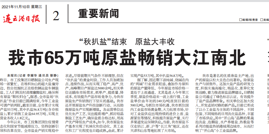 連云港日?qǐng)?bào)刊登:我市65萬(wàn)噸原鹽暢銷大江南北