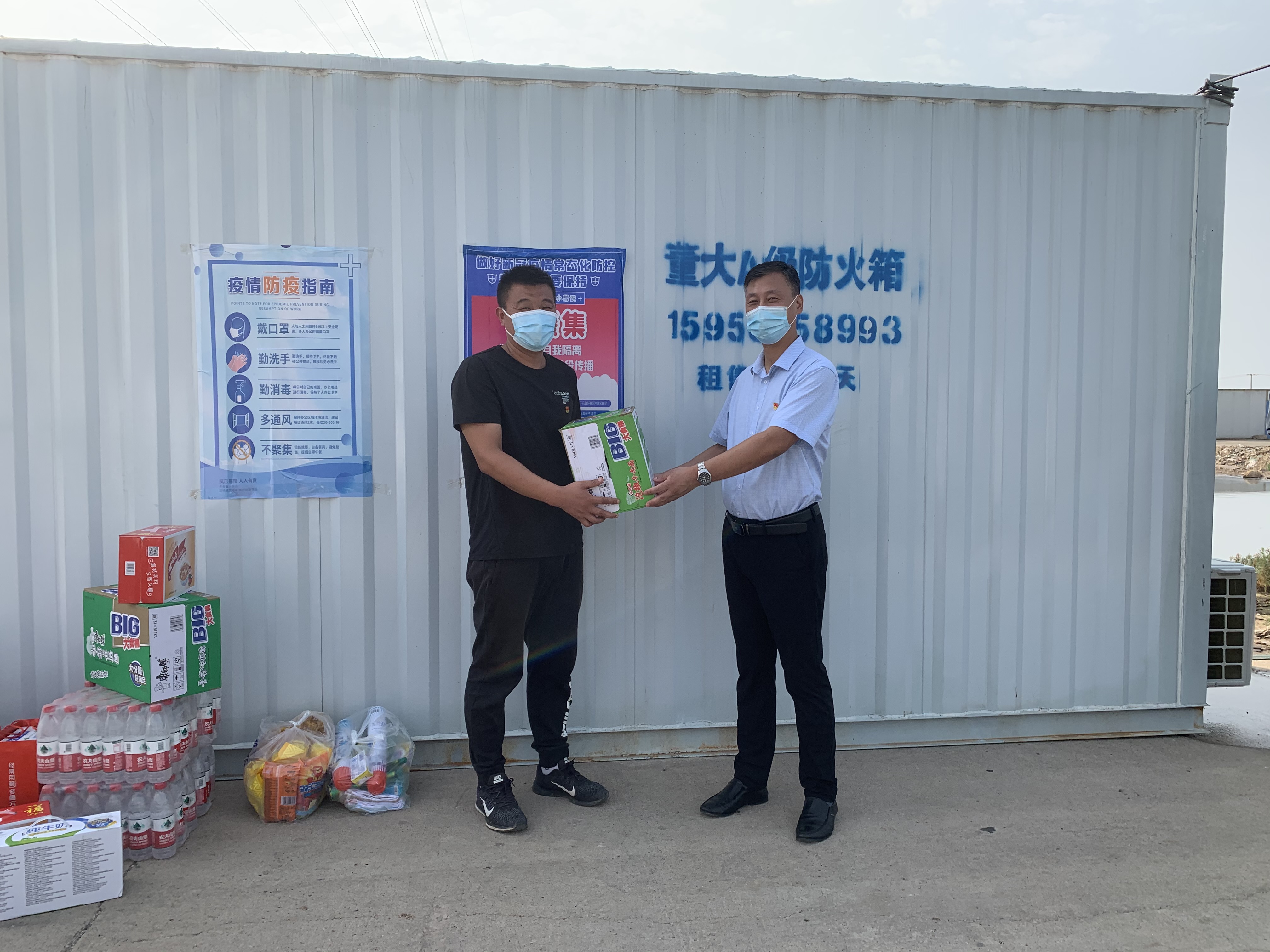 在各個路口卡點,公司領(lǐng)導(dǎo)向始終堅持在疫情防控一線的工作人員及志愿者們致以親切問候和衷心感謝,叮囑大家要強化自我防護,嚴格按照標(biāo)準(zhǔn)、程序、規(guī)范做好疫情防控工作,攜手共筑防疫屏障,并親手為他們送上、牛奶、八寶粥、方便面、蚊香等慰問物資。(西工)