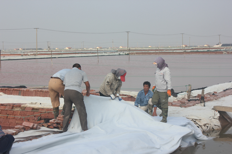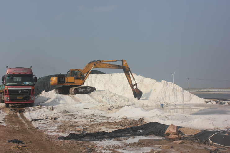 隨后我們又來到了新河制鹽分公司十四班的裝鹽現(xiàn)場。一位工人操作著挖掘機,往卡車上裝鹽銷售,如今裝鹽實現(xiàn)了機械化,工人的勞動負荷也減輕了許多。在埒南制鹽分公司的五班,我們看到七八個工人正在灘頭更換土工布,他們一字排開,先將土工布鋪開,然后分工合作,有的人負責(zé)把布理齊鋪平,有的則把磚頭鋪放在布上用來固化。