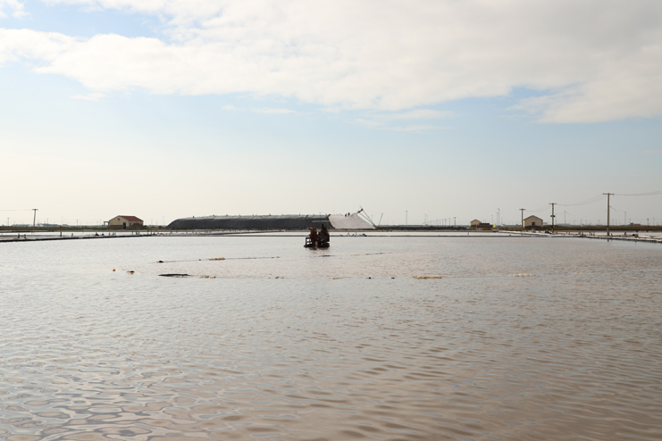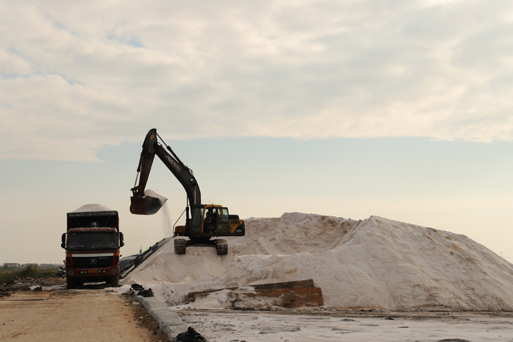 6日下午,在新河制鹽分公司的十二班,扒鹽機(jī)組正在扒鹽,在不遠(yuǎn)處鹽池內(nèi),集鹽機(jī)械正在鹽池內(nèi)緩緩移動(dòng)集鹽,鹽泵運(yùn)轉(zhuǎn)不停,輸鹽上廩,鹽廩上兩名大廩工正在不停筑廩。鹽池內(nèi),有的員工對(duì)破碴作業(yè)機(jī)械進(jìn)行修理,有的員工在整平扒過(guò)鹽的格塊,有的員工在活碴。筆者從該班班長(zhǎng)徐正好處了解到,該公司5號(hào)就開(kāi)機(jī)扒鹽了,下半年以來(lái),十二班已經(jīng)扒鹽7000余噸。在新河制鹽分公司的十一班,班長(zhǎng)葛高劍正帶領(lǐng)員工裝運(yùn)大廩布,做好扒鹽的準(zhǔn)備工作;在埒南制鹽分公司的九班,機(jī)聲隆隆,一名員正開(kāi)著活碴機(jī)械在鹽池內(nèi)作業(yè),不遠(yuǎn)處有幾名員工正用土工布叉格埝,對(duì)灘場(chǎng)進(jìn)行維修亮化;八班有一臺(tái)挖掘機(jī)正在鹽廩旁給裝鹽車(chē)輛上鹽……,日曬制鹽公司鹽灘上到處都活躍著職工們忙碌的身影。
