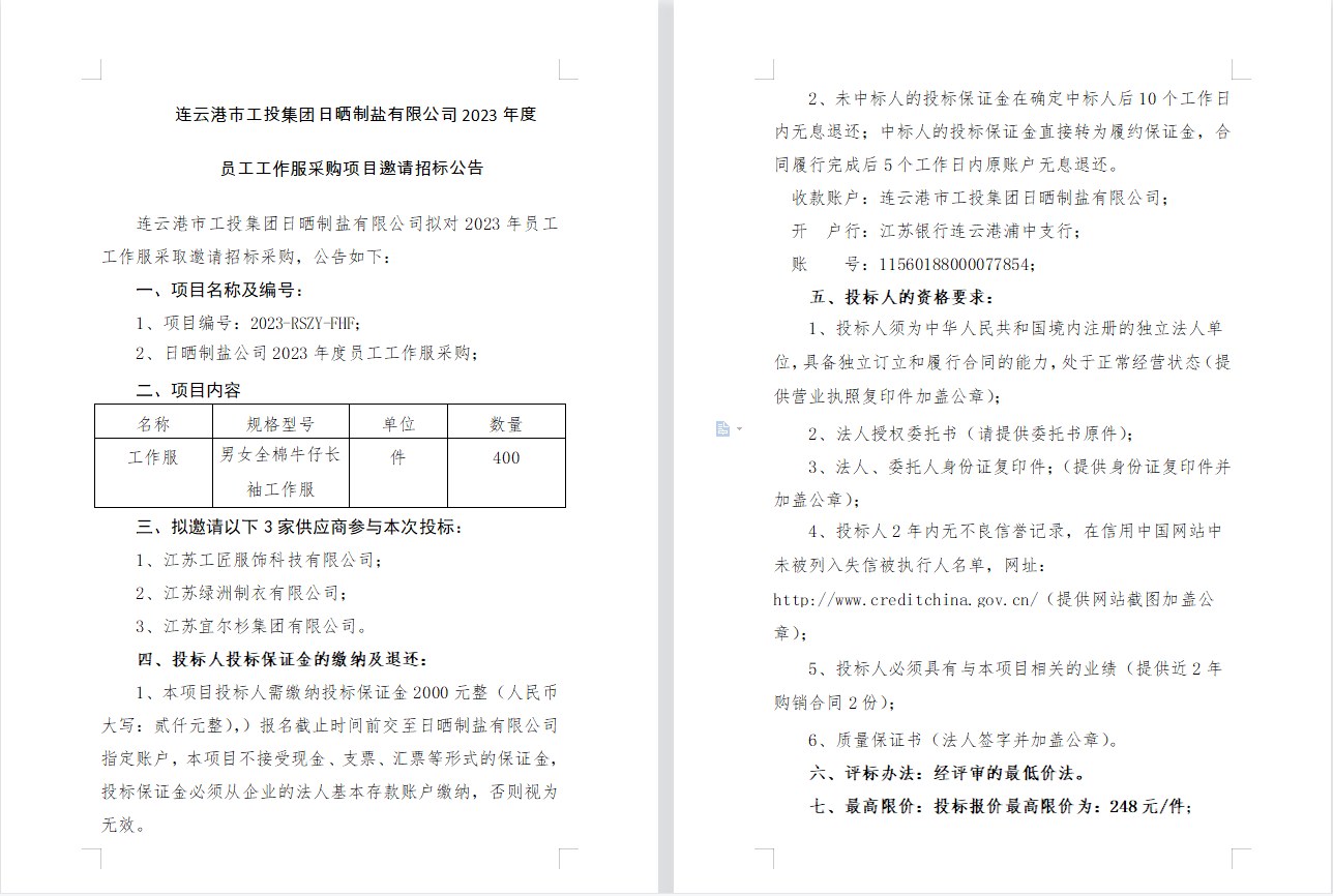 連云港市工投集團(tuán)日曬制鹽有限公司2023年度員工工作服采購(gòu)項(xiàng)目邀請(qǐng)招標(biāo)公告
