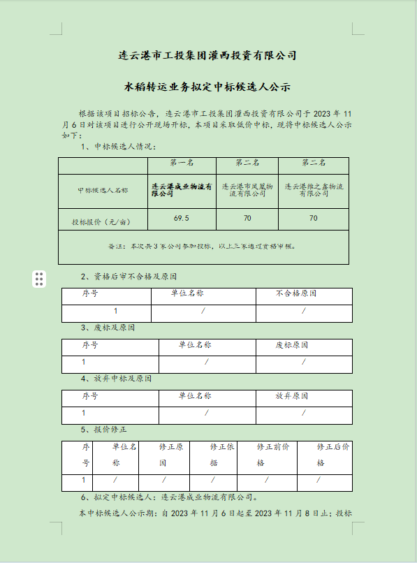 連云港市工投集團灌西投資有限公司水稻轉運業(yè)務擬定中標候選人公示