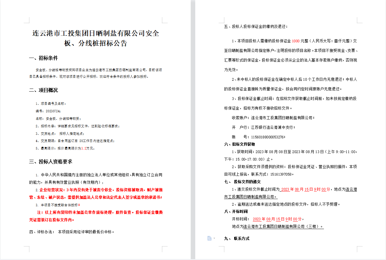 連云港市工投集團日曬制鹽有限公司安全板、分線樁招標(biāo)公告