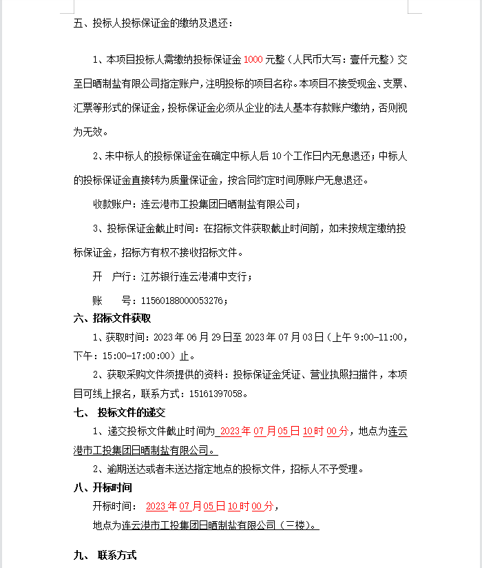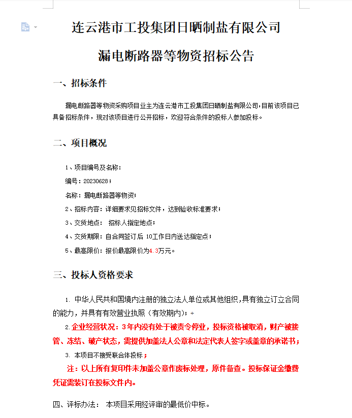 連云港市工投集團日曬制鹽有限公司漏電斷路器等物資招標(biāo)公告