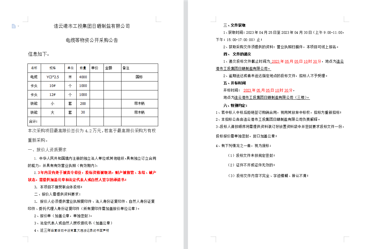 連云港市工投集團(tuán)日曬制鹽有限公司電纜等物資公開(kāi)采購(gòu)公告