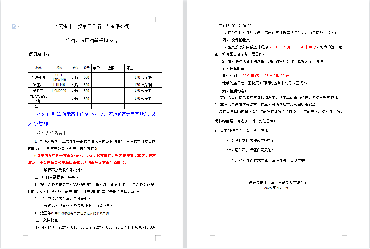連云港市工投集團(tuán)日曬制鹽有限公司 機(jī)油、液壓油等采購(gòu)公告