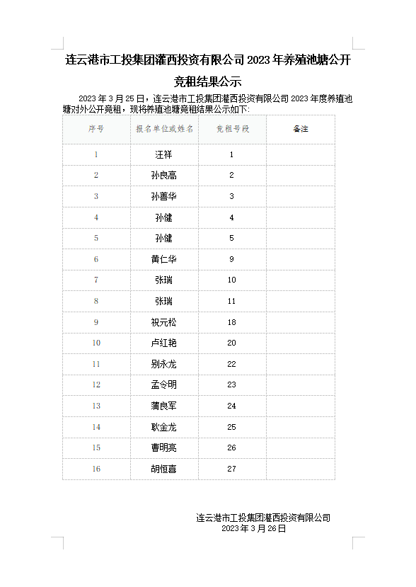 連云港市工投集團(tuán)灌西投資有限公司2023年養(yǎng)殖池塘公開競(jìng)租結(jié)果公示
