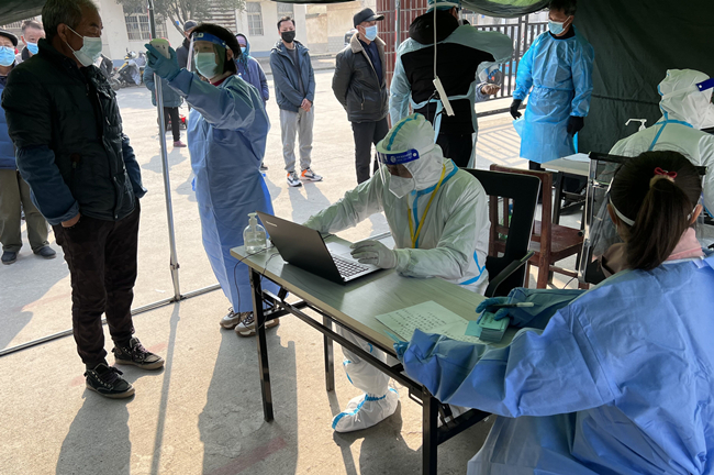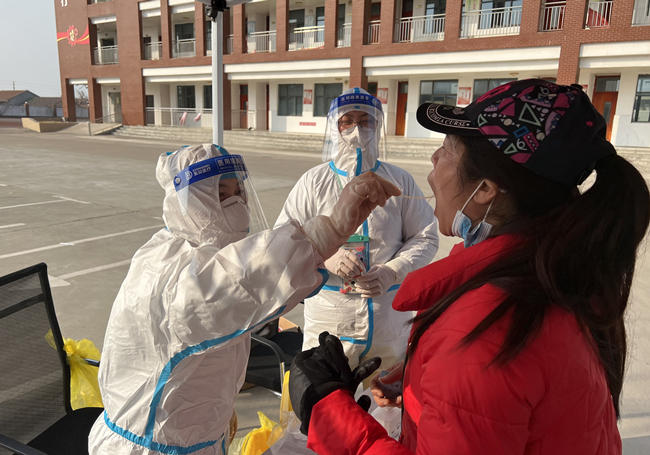 圖為黨員霍晶協(xié)助醫(yī)務(wù)人員對(duì)居民進(jìn)行核酸采樣