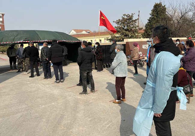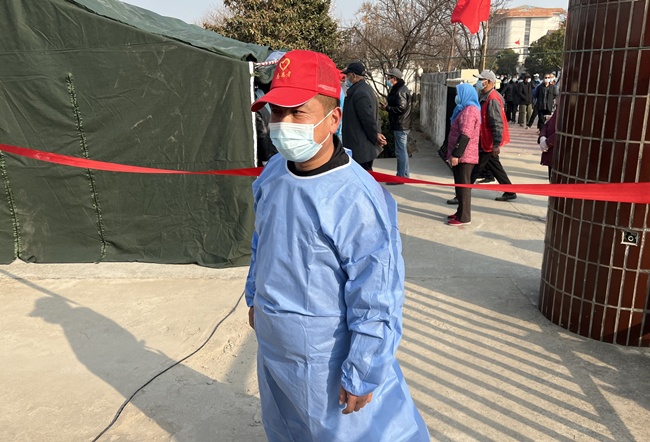 圖為黨員宋世園正引導(dǎo)居民做好核酸檢測(cè)準(zhǔn)備工作