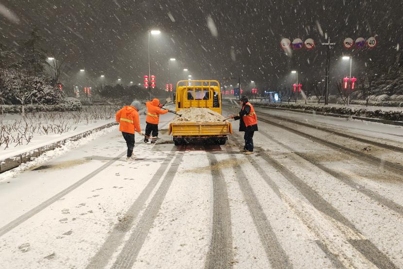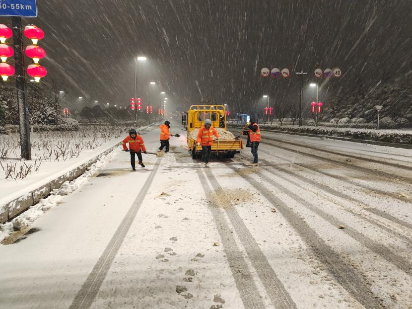 深夜時分,該公司負(fù)責(zé)人趙陽、副經(jīng)理孫振剛等領(lǐng)導(dǎo)班子成員及管理人員,帶領(lǐng)徐育華、王永等數(shù)名工人,對花果山大道及轄區(qū)易積雪區(qū)域和橋梁陡坡處、事故多發(fā)處開展清雪除冰工作。盡管刮著寒風(fēng),飄著雪花,大風(fēng)肆虐如刀割似的吹拂著臉頰,雪花染白了頭發(fā)、浸濕了衣袖、凍紅了臉龐,可身著橘色工作服的趙陽一行,面對這一難啃的骨頭,卻絲毫沒有懈怠,他們發(fā)揚螞蟻啃骨頭的精神,冒著嚴(yán)寒一直與冰雪搏斗。副經(jīng)理朱文江開著工具車慢慢前行,趙陽、孫振剛等人緊跟其后,一锨一锨奮力撒融雪劑,徐育華、王永等人則一點一點鏟除地面積雪,現(xiàn)場人員爭先恐后,配合默契,經(jīng)過一夜的連續(xù)作戰(zhàn),隨著太陽的升起,終于將公路上的“白色巨龍”降伏。在寒晨的冬陽下,他們拖著疲憊的身子離開清雪除冰現(xiàn)場,那身橘色的工作服猶如不滅的火炬,融化了冰雪,溫暖了行人。
