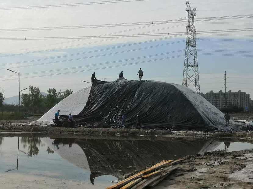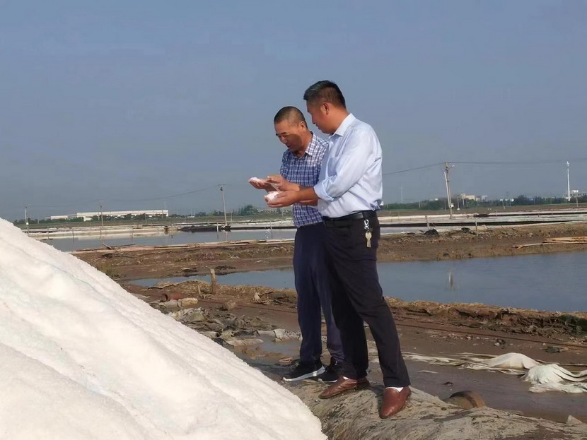第一片180公畝的曬鹽池已經(jīng)收鹽完畢,工人師傅們嫻熟有序用塑布對(duì)鹽廩進(jìn)行覆蓋,預(yù)防雨水造成鹽斤淌化。