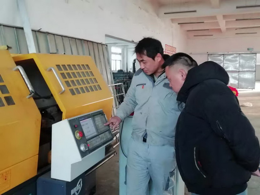 ▲2021年度星級員工-趙原塵(藍(lán)衣)指導(dǎo)新員工操作數(shù)控機(jī)床