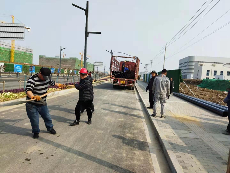 3月14日清晨,在金橋路管道施工現(xiàn)場(chǎng),早已是人頭攢動(dòng)、號(hào)子聲響,隨著一根根9米長(zhǎng)的PE250管道被有條不紊的卸下車,金橋路鈣液管道遷建工程順利拉開序幕。