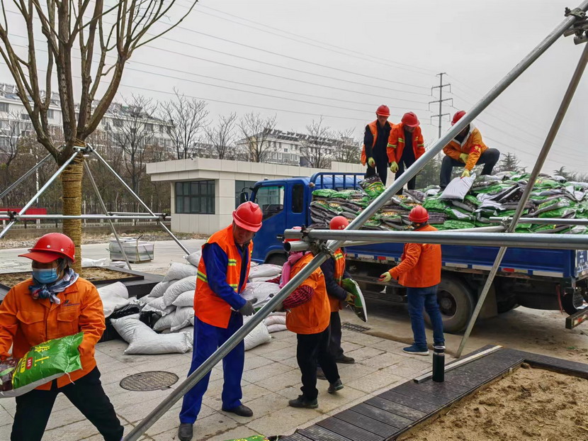 納?;ň趁娣e為126㎡,施工周期27日至31日,共5天。此次栽植前工作不同于以往,要先在底部鋪設(shè)排水板、土工布及2cm厚陶粒墊層,保證花箱底部透氣性及在降雨時(shí)能及時(shí)排出積水,再鋪設(shè)25cm厚黑泥土加20cm厚營養(yǎng)土拌5%沙,滿足植物的生長需要,完成栽植后在土壤上層鋪設(shè)2cm厚麥飯石。