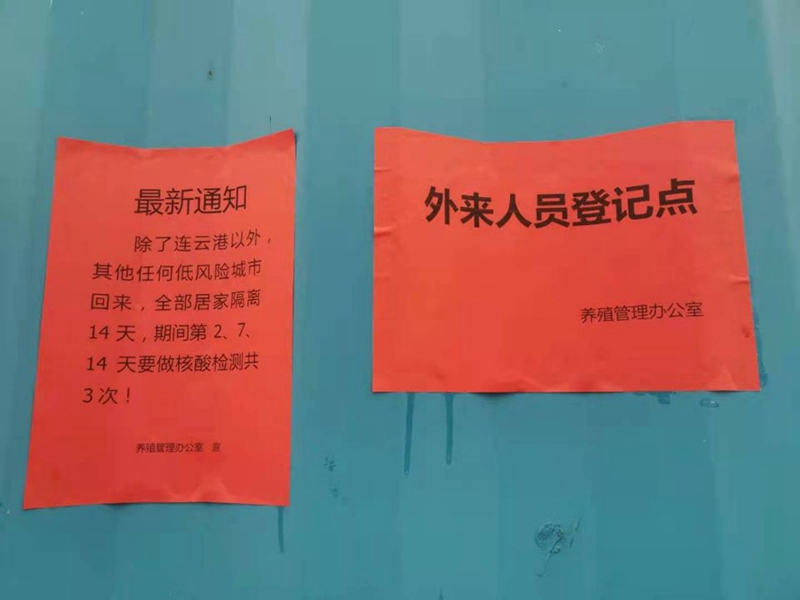 養(yǎng)殖管理辦公室迅速反應(yīng),成立防疫領(lǐng)導(dǎo)小組,加強(qiáng)值班值守,設(shè)置疫情防控設(shè)置隔離點(diǎn)、外來(lái)人員登記點(diǎn),張貼疫情動(dòng)態(tài)通知。養(yǎng)殖辦全員到“塘頭”排查是否有人員與中高風(fēng)險(xiǎn)地區(qū)回連人員的接觸史(包括家人和周邊鄰居)和疫苗接種情況;對(duì)來(lái)往車(chē)輛和人員進(jìn)行逐一登記排查,宣傳防疫注意事項(xiàng);并要求養(yǎng)殖戶(hù)不得雇傭除了連云港以外人員干活、不得讓除了連云港以外人員或車(chē)輛在池塘進(jìn)出。