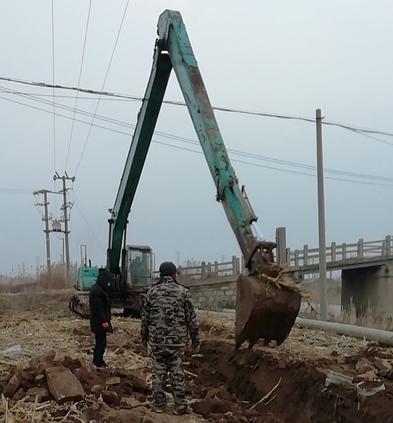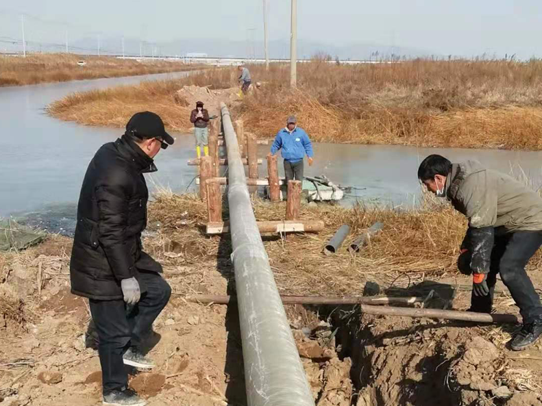 難!難!難!有困難才具有挑戰(zhàn),在“四拼”前一切困難皆為“紙老虎”,大家及時(shí)將壓力變?yōu)閯?dòng)力。確定方案后,立即分頭行動(dòng),一切工作按部就班,購買8米木樁,河岸邊專人指揮長臂挖掘機(jī)機(jī)械打樁,頭頂高壓線與通信線路相互交織,現(xiàn)場安全員全過程監(jiān)督指揮保障施工安全距離緊張施工,利用簡易泡沫筏人工敲開河面冰層,劃到河心鉆孔安裝木橫擔(dān),人工開挖河對岸管道,切割吊取管道,打磨涂覆,一切都在有條不紊的進(jìn)行中??紤]到玻璃鋼管道的易碎性,不敢使用挖掘機(jī)吊裝,只能全人工小心翼翼的一小段一小段的輕抬慢放,慢慢挪到門型橫擔(dān)上緩緩過河,捆綁固定,最后是對口纏裹涂覆回填竣工。