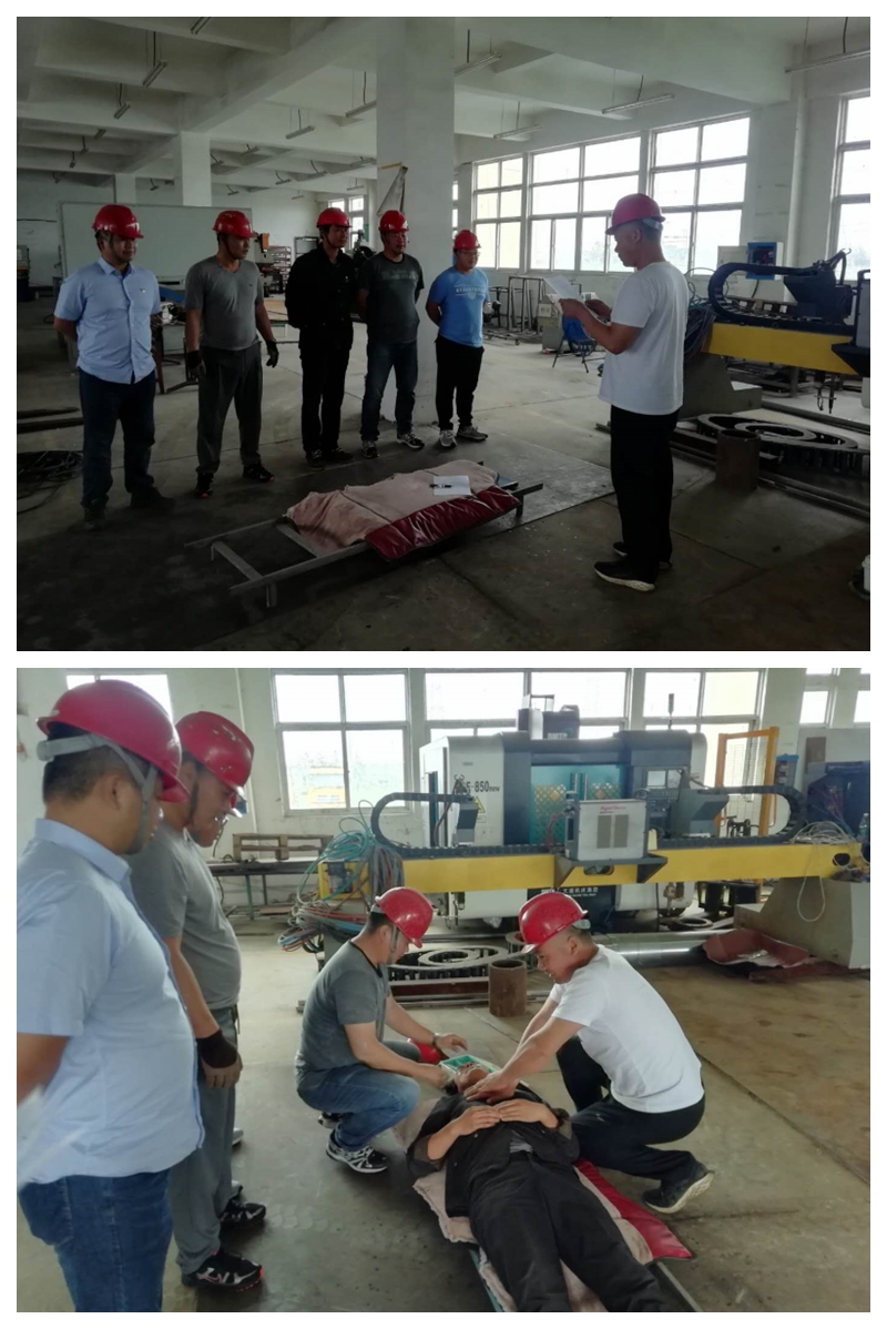 本次演練方案模擬在精工車間正常生產(chǎn)過程中,因?qū)﹄姎庠O(shè)備沒有經(jīng)常性檢查,液壓切板機(jī)切板時掉落的鋼板未采取防范措施將電氣電纜砸斷搭鐵,造成液壓切板機(jī)金屬外殼帶電,作業(yè)人員在正常操作機(jī)床時造成觸電事故傷害。當(dāng)同事發(fā)現(xiàn)有人觸電后,立刻做出救援反應(yīng),切斷電源將觸電人員安全隔離開后抬到擔(dān)架上進(jìn)行搶救。并同時上報(bào)應(yīng)救援指揮組,指揮組迅速做出響應(yīng),啟動防觸電應(yīng)急預(yù)案,大家按應(yīng)急預(yù)案的分工迅速開展救援工作,撥打120急救電話、拉警戒線、查看傷情、緊急搶救、人工心肺復(fù)蘇等,直至觸電者蘇醒,在大家的共同協(xié)作下演練圓滿成功,翔立分公司湯占國總經(jīng)理對此次演練效果進(jìn)行了總結(jié)和點(diǎn)評。