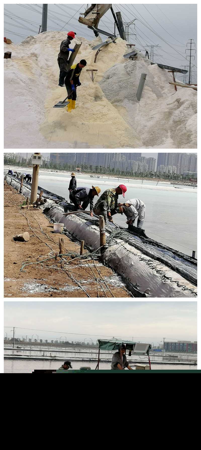 沒有參加扒鹽的人員也沒閑著,他們將工作重心轉(zhuǎn)移到苫布保鹽工作中來,苫鹽廩布、整理樁繩、修補(bǔ)、拉放塑布,對存鹽廩基等區(qū)域進(jìn)行疏通加固,以及扒鹽后有序推進(jìn)灘場文明等等。特別是東灘,為了盡早完成1680公畝的灌池任務(wù),至三月初以來,工人們起早貪黑、放棄節(jié)假日克服一切困難,經(jīng)過多方共同努力現(xiàn)已灌池1200多公畝,預(yù)估池內(nèi)長鹽已達(dá)8000多噸。面對雨季即將到來之際,各單元在保證鹽色、鹽質(zhì)做好安全扒鹽的同時,抓住晴好天氣強(qiáng)化大面積制鹵,加大走水深度和節(jié)制,充分利用蒸發(fā)量多制鹵、制好鹵為順利度過汛期做好一切準(zhǔn)備。