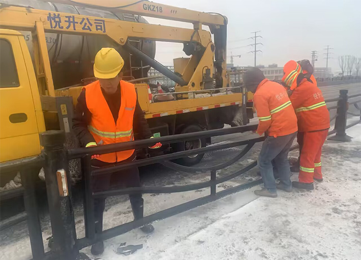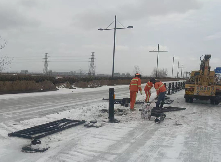 近兩日,因雨雪天氣,道路結冰濕滑,車輛行駛過程中發(fā)生意外,造成港前大道、海濱大道、228國道等地段發(fā)生多起道路護欄等設施損壞情況。收到信息后,市政分公司道路養(yǎng)護人員迅速反應,在班長孫寬成帶領下,隊員們頂風冒雪第一時間趕赴現(xiàn)場。