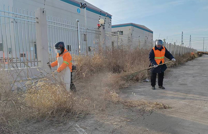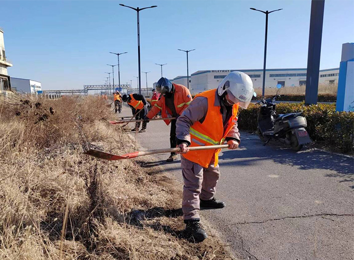 該分公司園區(qū)兩個班組近35名保潔勇士,無懼低溫刺骨天氣,匯聚石化十路、石化三道道路兩側(cè)。勞動現(xiàn)場,黨員骨干示范帶頭作用處處體現(xiàn)。石峰、朱海勇、楊靜身背幾十斤重打草機,無所怨言,持續(xù)工作時長達三個多少時。在他們的帶動下,班組人員一字排開,分工明確,各負(fù)其責(zé)。