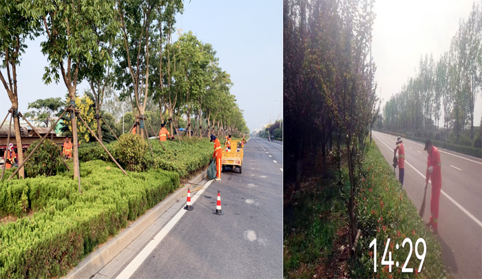 為提高工作效率,該分公司綠化班組在云港路、祥和路核心區(qū)域,采取人機結(jié)合方式,兵分4路同步推進“秋剪”作業(yè)。既:1路,班長帶領(lǐng)工人負(fù)責(zé)對道路中間球類修剪造型。植物相對茂盛,腳下視野遮擋,工人舉著機器,一步一步往前推進作業(yè)。2路,負(fù)責(zé)對道路兩側(cè)色帶綠籬安排修剪,及時清理枯樹枝和雜草保持綠化帶干凈整潔。3路,綠化帶內(nèi)高凹不平雜草遮住視野,作業(yè)有點難度,在安全員的帶領(lǐng)下用割灌機負(fù)責(zé)對道路兩側(cè)密集的雜草進行清理作業(yè)。4路,用掃把和網(wǎng)兜清掃前面一組剪掉的碎葉,保障道路整潔暢通。